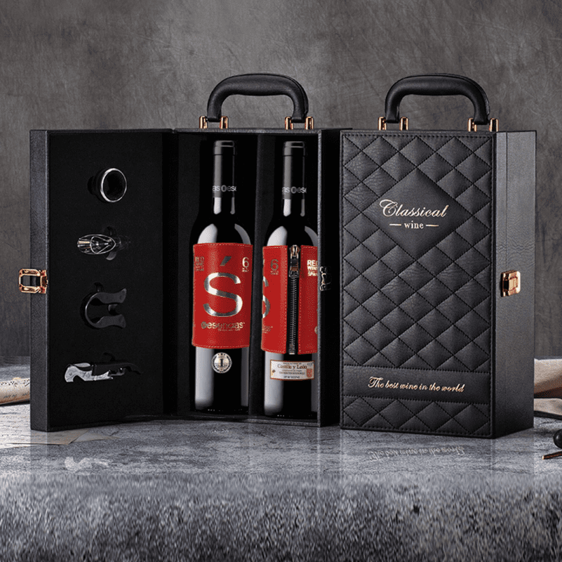 Estuche Maletín de LUJO con 2 Exclusivos Vinos Etiqueta de Cuero y Set de 4 Accesorios.
