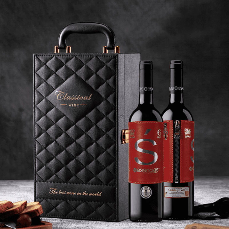 Estuche Maletín de LUJO con 2 Exclusivos Vinos Etiqueta de Cuero y Set de 4 Accesorios.